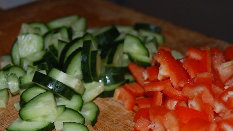 2.Do miski przełóż posiekaną kapustę, pokrojony w kosteczkę pomidor, obrany ogórek, paprykę, obrane jabłko, wędzoną kiełbasę oraz wędzony ser.