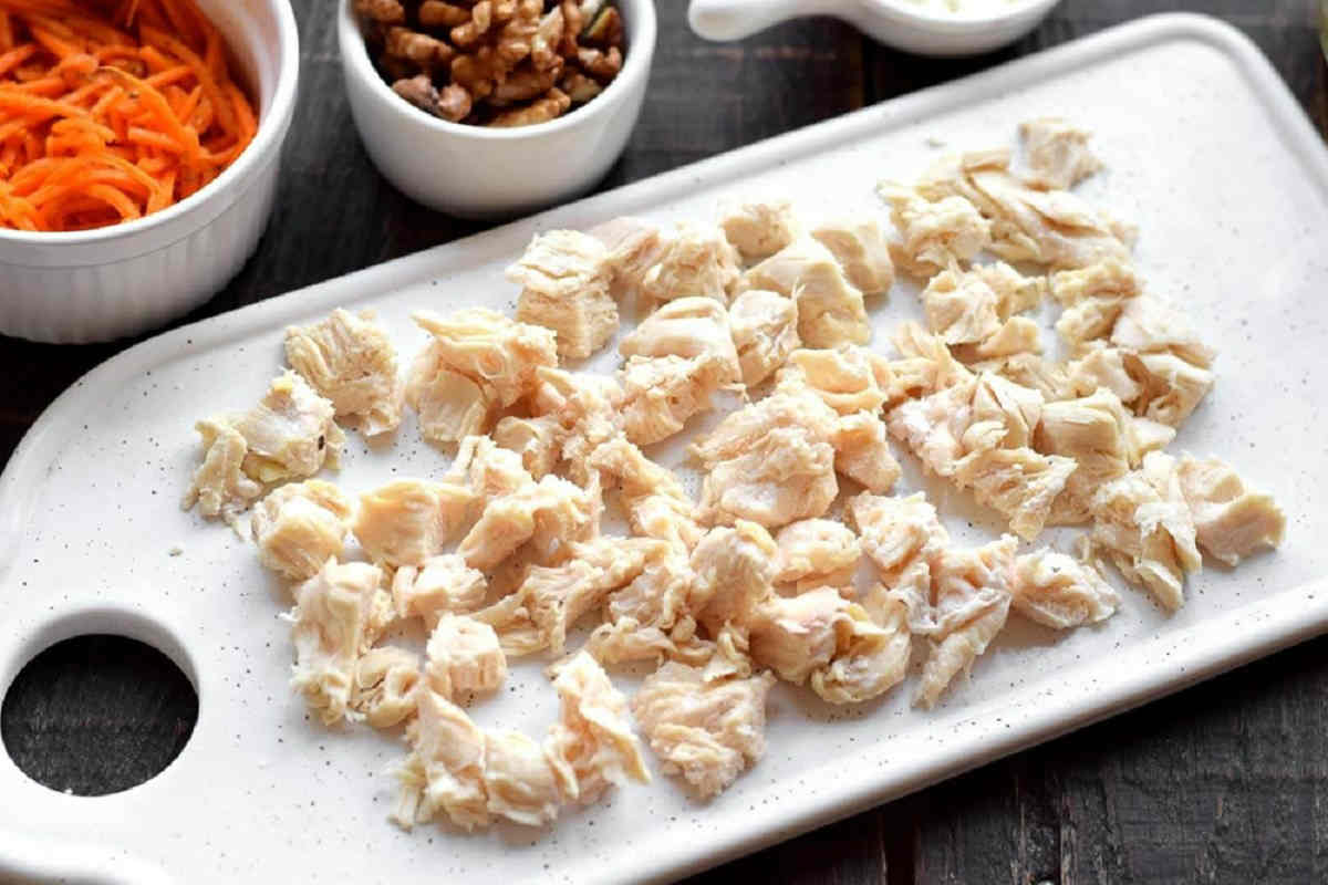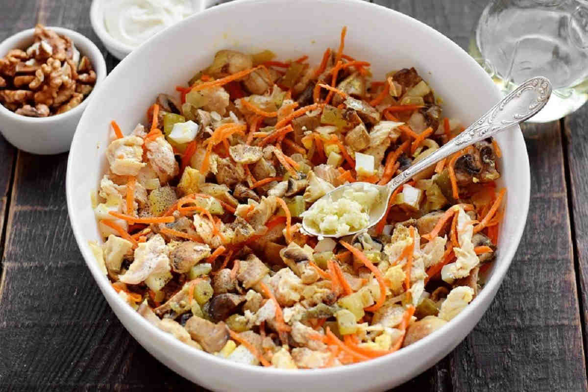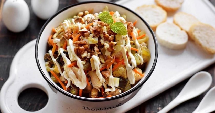 4. Przed podaniem, udekoruj sałatkę majonezem i posiekanymi orzechami włoskimi. Gotowe!