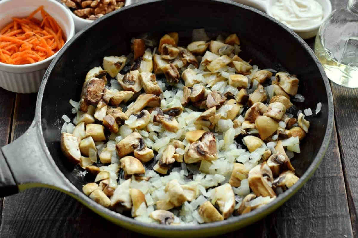 1. Obierz cebulę, pokrój w drobną kosteczkę i smaż na rozgrzanej patelni z olejem przez 2 minuty. Potem, dodaj pokrojone w kostkę pieczarki, dopraw do smaku solą, wymieszaj i smaż na średnim ogniu przez kolejne 5 minut. Następnie przełóż do miski i wystudź.