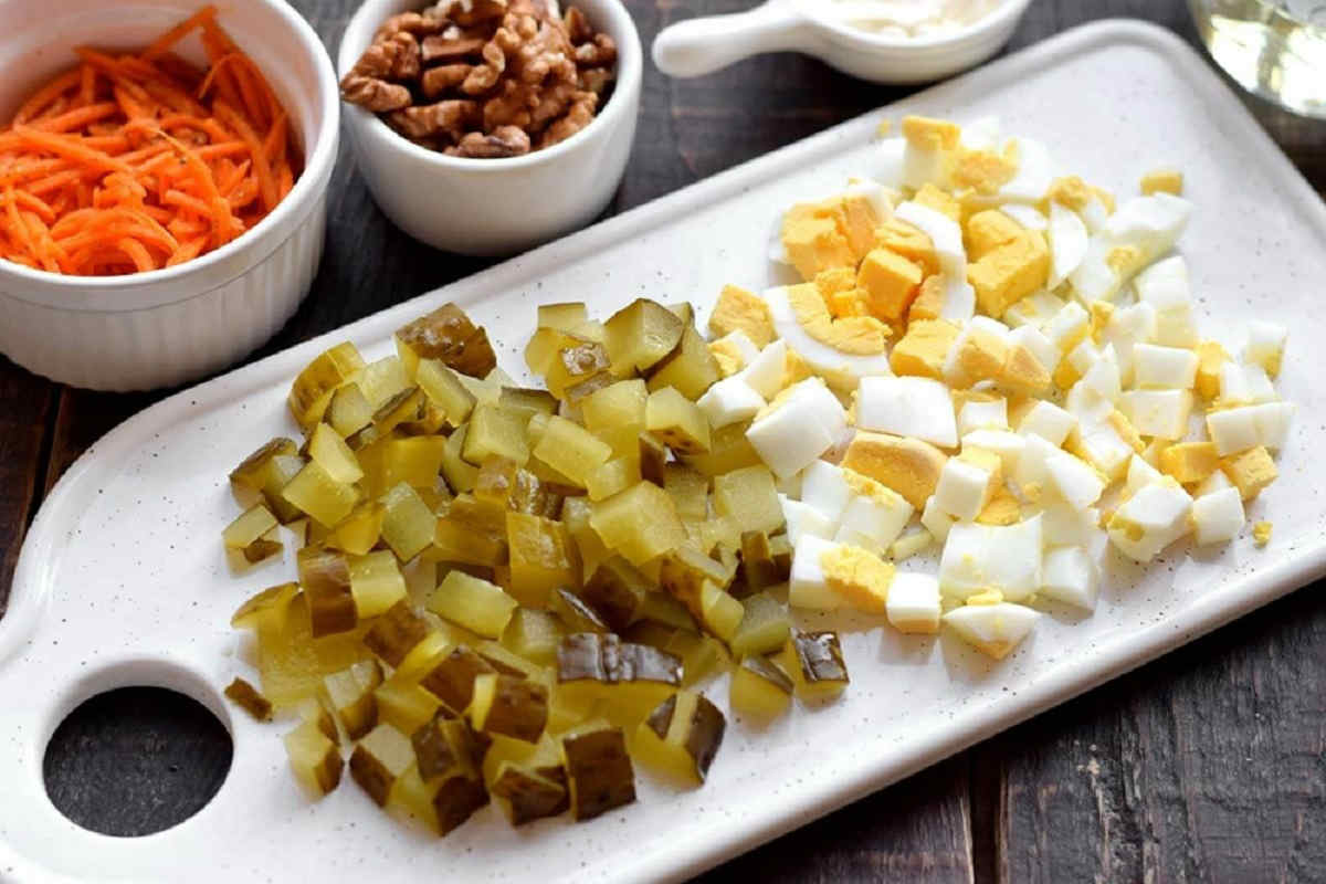3. Teraz, połącz ze sobą wszystkie składniki i dodaj odsączoną z zalewy marchewkę koreańską, pokrojoną w mniejsze słupki. Dodaj przeciśnięty przez praskę czosnek, dopraw do smaku solą, pieprzem, majonezem i wymieszaj.