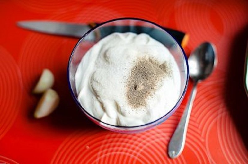 2. Koperek posiekaj, a ogórki pokrój w kosteczkę. Majonez połącz z jogurtem, dodaj czosnek przeciśnięty przez prasę i pieprz.