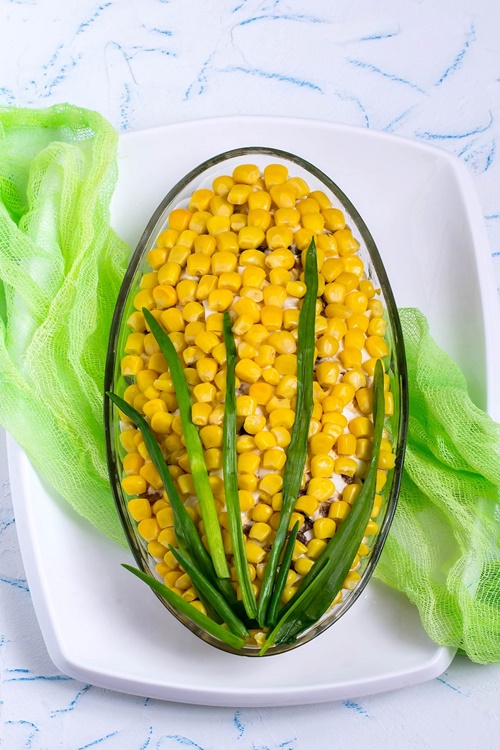 5. A teraz najciekawsze – dekoracja! Ułóż jednolitą warstwę kukurydzy (najlepiej, jeśli ziarna są duże, wtedy dekoracja pójdzie znacznie szybciej), udekoruj szczypiorkiem, imitując jej liście.