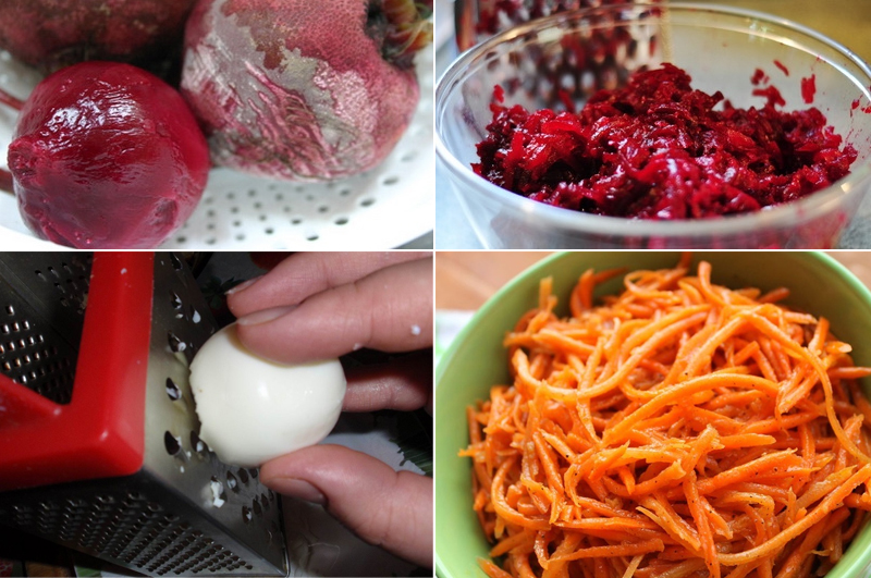1. Ugotuj do miękkości buraka i ziemniaki. Zetrzyj je do osobnych pojemników na tarce o grubych oczkach. Jabłko i jajka zetrzyj na tarce o średnich oczkach. Przygotuj marchewkę po koreańsku wcześniej lub kup gotową w sklepie.