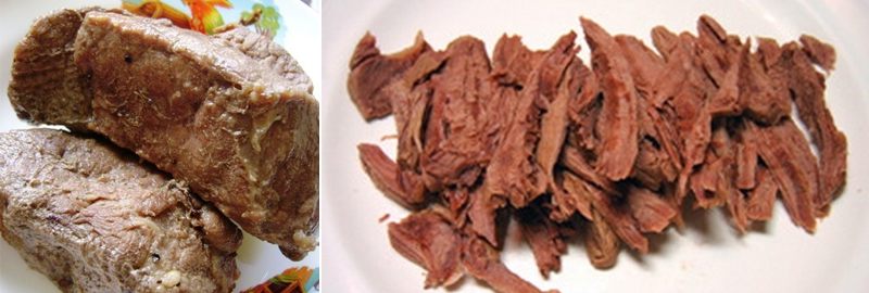 2. Ugotowaną wołowinę pokrój w paski i ułóż na dużym płaskim talerzu w formie do pieczenia ze zdejmowanymi bokami. Posmaruj mięso chrzanem i majonezem, posyp groszkiem konserwowym.