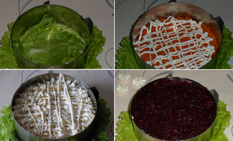 3. Następnie poukładaj warstwami kolejno: ziemniaki, marchewkę, jajka i buraki. Każdą warstwę posmaruj majonezem.