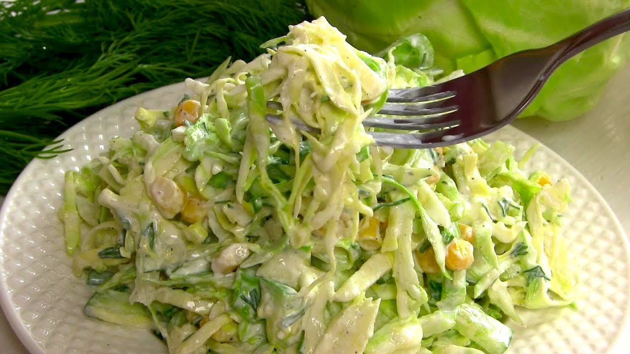 Umyj wszystkie owoce i warzywa. Ogórka należy pokroić w kółeczka i w paski. Poszatkuj kapustę. Następnie zawartość umieść w misce. Potem obierz jabłko i dodaj kilka kropel soku z cytryny. A teraz wszystkie produkty umieść w misce wraz z jogurtem, solą i przyprawami, które lubisz. Dodaj kukurydzę i wszystko dobrze wymieszaj.