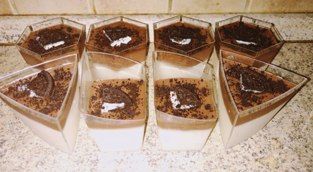 2.Tak przygotowaną masę przełóż do kubeczków. Za pomocą łyżki dokładnie wygładź, następnie zacznij dekorację.