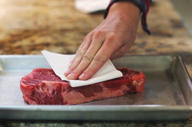 2. Aby mięso było dobrze usmażone, należy je wysuszyć z nadmiaru wody papierowym ręcznikiem. Faktem jest, że nadmiar wilgoci wytwarza parę, co spowalnia proces prażenia i brązowienia.