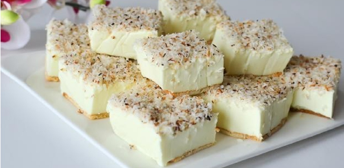 3.Na dnie pokrytej papierem do pieczenia blachy o wymiarach 20 x 20 cm wyłóż herbatniki. Następnie na ciasta wyłóż dokładnie całą masę twarogową i całość posyp pięknie wyglądającymi wiórkami kokosowymi .