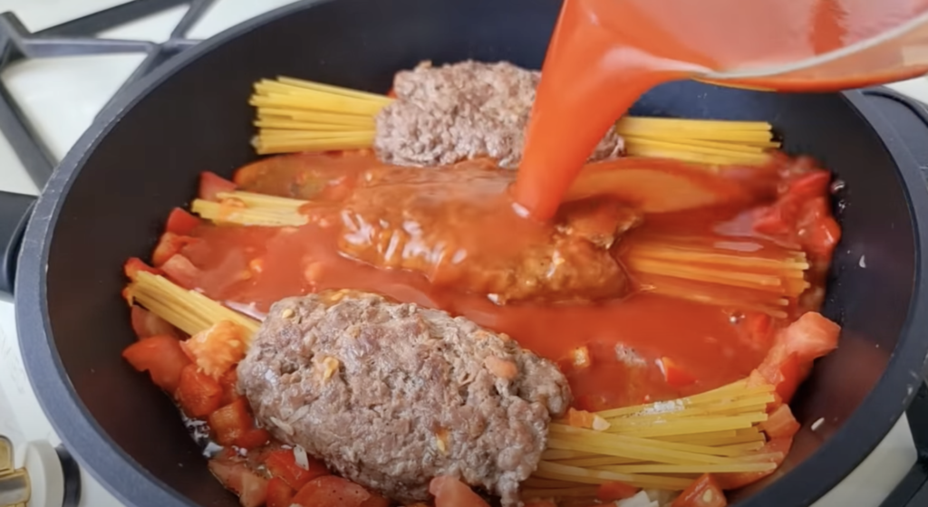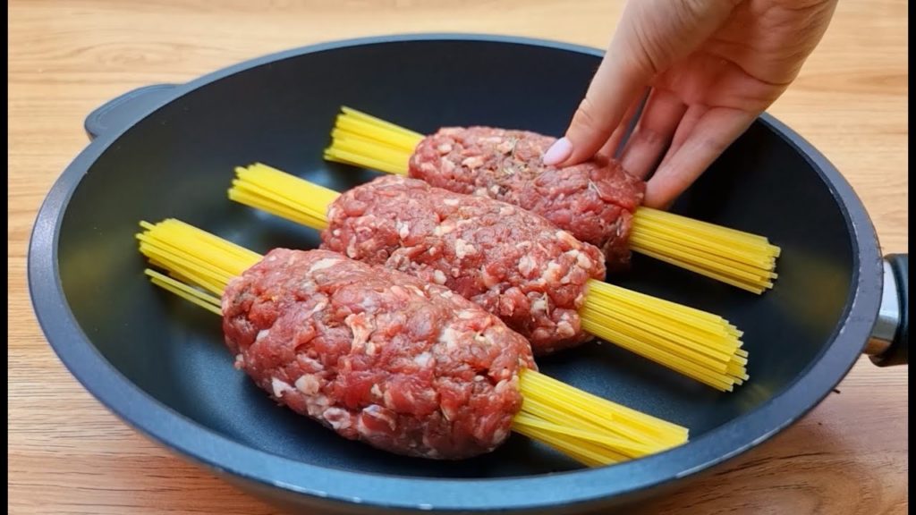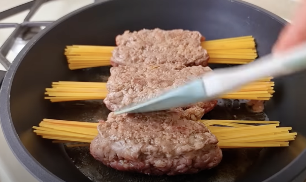 3. Owiń mięsem makaron i podsmaż na rozgrzanej patelni z olejem z każdej strony.