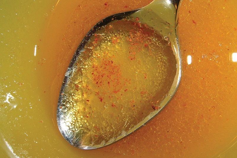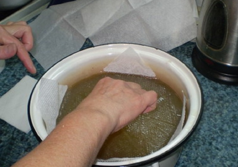 6. Na tym etapie możesz usunąć nadmiar tłuszczu z bulionu. Łatwo to zrobisz ręcznikiem papierowym: połóż go delikatnie na powierzchnię bulionu i natychmiast podnieś. Powtórz tę procedurę kilka razy. Dopraw do smaku solą i pieprzem.