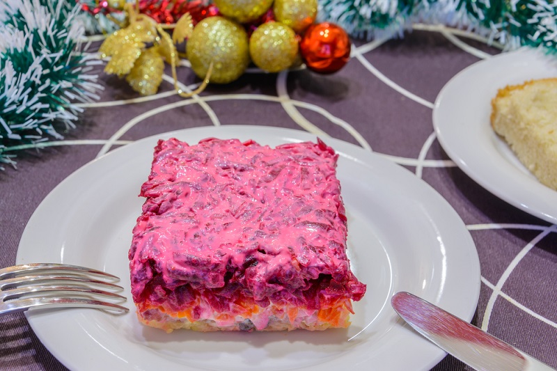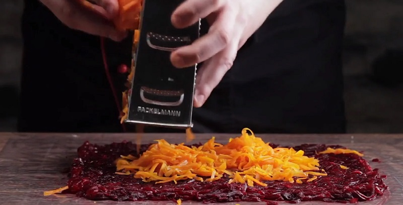 4. Osobliwością tej opcji sałatki śledziowej jest to, że warstwy są ułożone w odwrotnej kolejności. Dlatego zaczynamy od buraków.