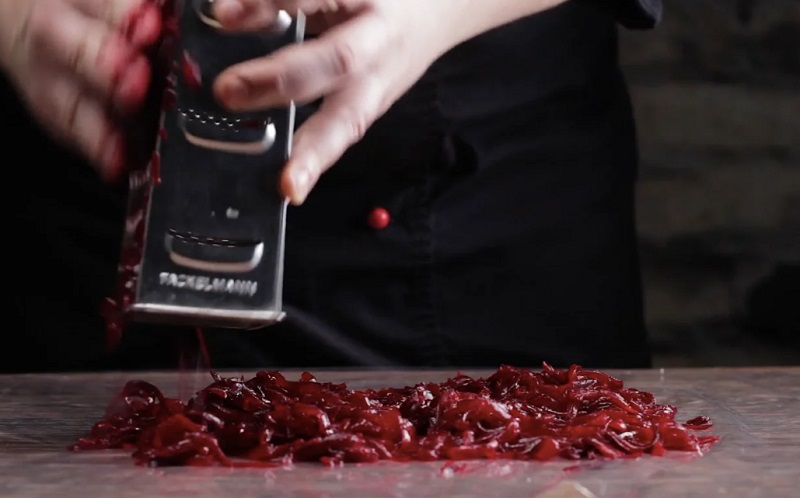 5. Zetrzyj buraki na tarce o grubych oczkach i ułóż cienką prostokątną warstwę na folii. Lekko posól.
