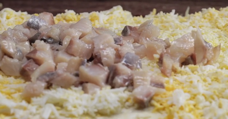 9. Pokrojone na małe kawałki filety śledziowe będą kolejną warstwą.