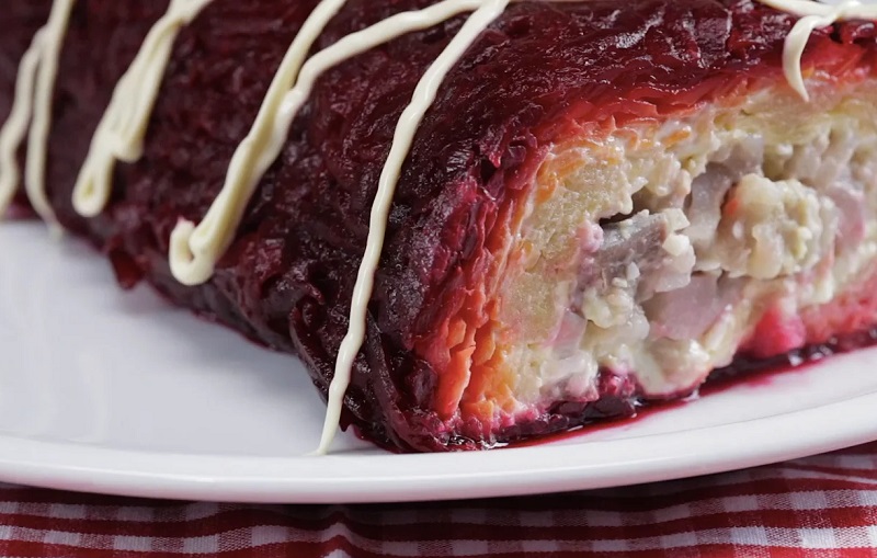 11. Ostrożnie zawiń ciasno wszystkie warstwy w rolkę, lekko dociskając, aby sałatka nie rozpadała się podczas krojenia na porcje.