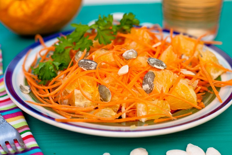 4. Dodaj nasiona i wymieszaj wszystkie składniki. Teraz dodaj sól, pieprz i sos sałatkowy z oliwą z oliwek do smaku. Pyszna, aromatyczna surówka z marchewki jest gotowa. Smacznego!