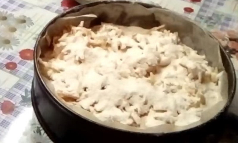 3. Wlej jedną trzecią „ciasta” do blaszki do pieczenia i równomiernie rozprowadzić. Następnie dodaj jedną trzecią startych jabłek i wygładź warstwę. Powtórz procedurę 2 razy.
