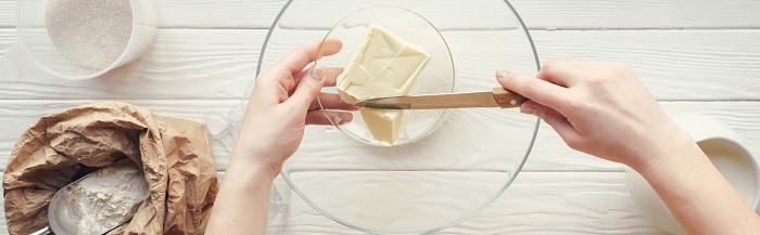 2. Dodaj zimne masło i utrzyj je z suchymi składnikami.