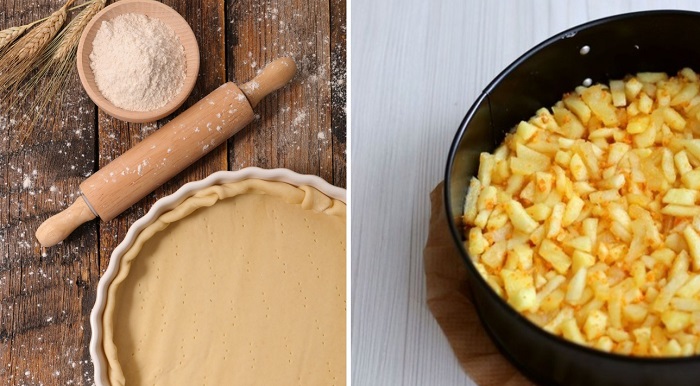 Dodaj jedną część ciasta do formy, wygładź i lekko dociśnij. Następnie rozłóż na nim masę jabłkową.