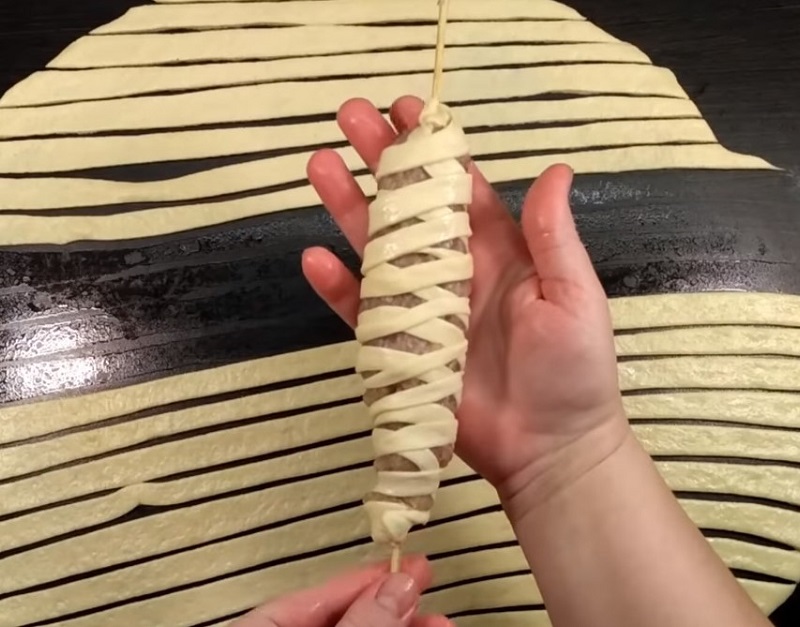 8. Owiń każdy szaszłyk w dwa paski ciasta. Możesz ciasto wysmarować roztrzepanym żółtkiem jajka i posypać sezamem (opcjonalnie).