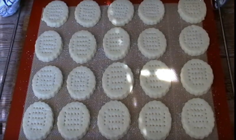 4. Odciśnij okrągłą foremką ciasteczka i widelcem ponakłuwaj ich powierzchnię. Potem posyp cukrem.