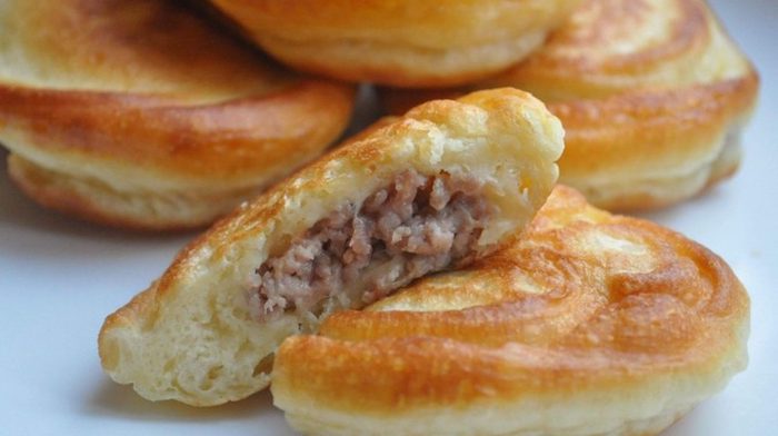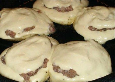 6. Ciasto na patelnię wkładaj za pomocą łyżki , a na nie nadzienie z mięsa mielonego i przykrywamy kolejną warstwą ciasta. Czynność tą staraj się robić szybko.