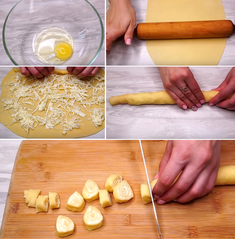 2. Rozwałkuj ciasto na cienką warstwę i posyp tartym serem. Zawiń rolkę szczelnie i połącz krawędzie. Uszczelnij ją trochę na całej długości, aby ser z niej nie wypłynął. Następnie potnij na porcje o szerokości około 1 cm.