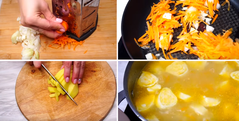 4. Podsmaż cebulę pokrojoną w kostkę i z tartą na oleju roślinnym i wrzuć do gotującego się bulionu.