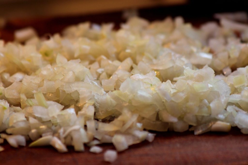3. W czasie, gdy makaron się gotuje, możemy przygotować sos Stroganow. Najpierw obieramy cebulę. Siekamy ją drobno.