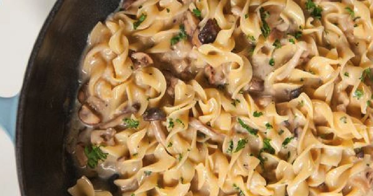 Makaron w stylu Stroganowa, którego przyrządzenie opisano poniżej, smakuje znakomicie, pomimo tego, że do jego przygotowania nie używa się ani kawałka mięsa.
