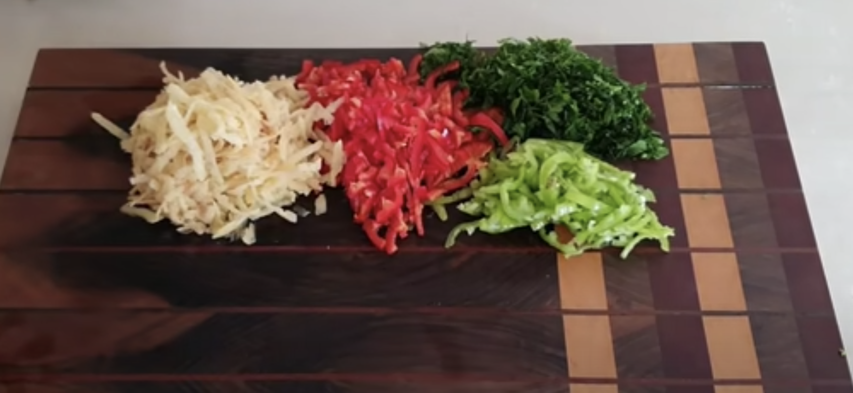 1.Na tarce o grubych oczkach zetrzyj obranego ziemniaka, następnie drobno pokrój pietruszkę oraz paprykę.