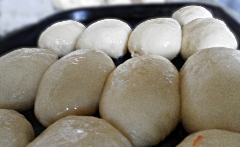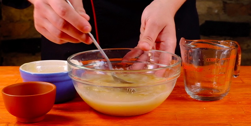 Wodę wlać do patelni, dodać masło i podgrzewać aż do rozpuszczenia. Pozostawić do ostygnięcia. Rozpuszczone w wodzie masło nie powinno być ani gorące, ani zimne. Dodać resztę składników – drożdże, sól, olej słonecznikowy, cukier. Połączyć składniki wszystko mieszając.