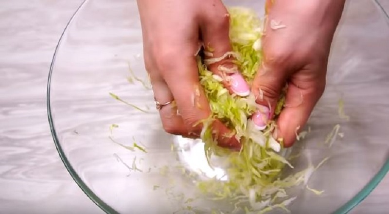 2. Podczas gdy kasza się gotuje, możesz przygotować wszystkie pozostałe składniki. Zacznij od kapusty. Pokrój ją bardzo drobno, dodaj trochę soli.