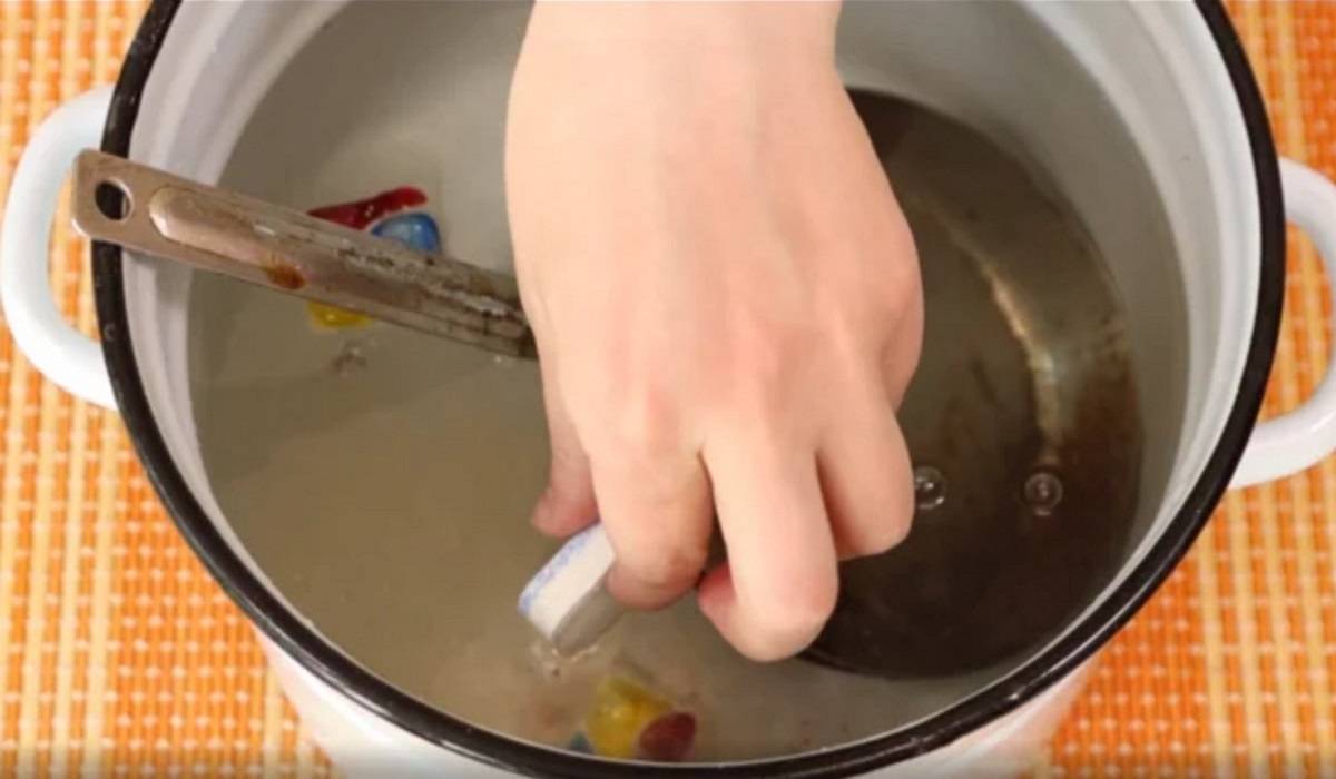 1.W dużym garnku umieść zabrudzoną patelnie z wodą. Następnie wlej do garnka wodę i umieść w nim także tabletkę do zmywarki.