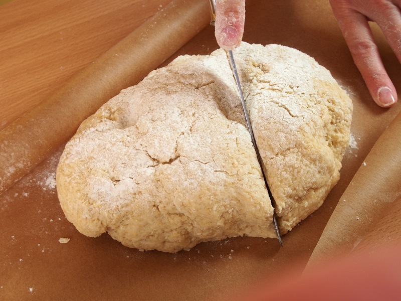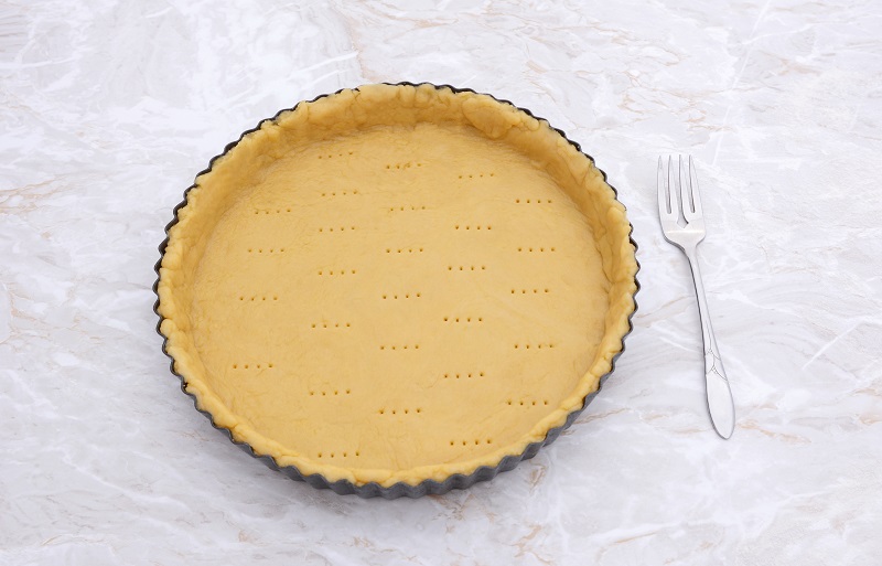 3. Na posmarowanej tłuszczem formie rozłóż ciasto, odetnij jego nadmiar, wystający z formy. Nakłuj ciasto widelcem na całej powierzchni.