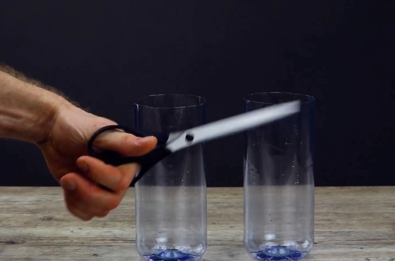 Teraz musimy odciąć górne części plastikowych butelek, a to, co zostanie, przeciąć jeszcze raz po długości.