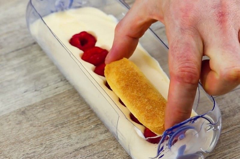 Na masie układamy rządek malin, a następnie dwa-trzy biszkopty uprzednio zamoczone w kawie.