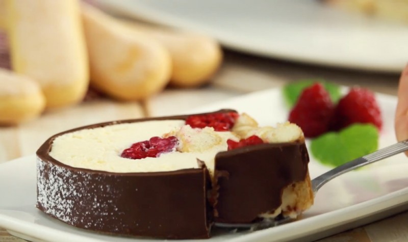 Odstawiamy tiramisu na 3 godziny do zamrażalnika. Po tym czasie wyjmujemy ciasto z foremki, polewamy roztopioną czekoladą. Jeśli ktoś chce, można udekorować tiramisu malinami i posypać cukrem pudrem.