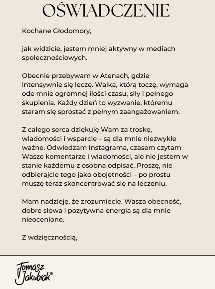 „Kochane Głodomory, jak widzicie, jestem mniej aktywny w mediach społecznościowych. Obecnie przebywam w Atenach, gdzie intensywnie się leczę. Walka, którą toczę, wymaga ode mnie ogromnej ilości czasu, siły i pełnego skupienia. Każdy dzień to wyzwanie, któremu staram się sprostać z pełnym zaangażowaniem. Z całego serca dziękuję Wam za troskę, wiadomości i wsparcie — są dla mnie niezwykle ważne. Proszę, nie odbierajcie tego jako obojętności — po prostu muszę teraz skoncentrować się na leczeniu. Mam nadzieję, że zrozumiecie. Wasza obecność, dobre słowa i pozytywna energia są dla mnie nieocenione.”