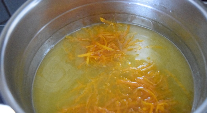 9. Teraz czas na krem. Wymieszaj 80 ml soku pomarańczowego ze 150 g cukru i gotuj na wolnym ogniu, aż do całkowitego rozpuszczenia się cukru, ciągle mieszając. Dodaj skórkę pomarańczową i gotuj przez 5 minut od momentu wrzenia bez mieszania.
