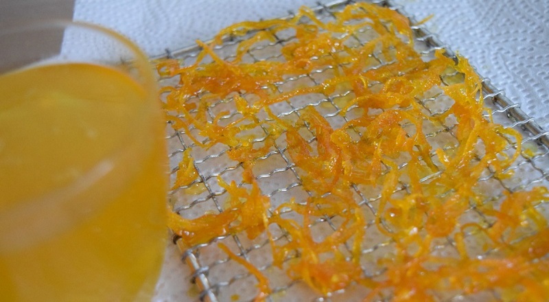 10. Zdejmij garnek z ognia, oddziel od syropu skórkę i odstaw do wystygnięcia. Skórkę kandyzuj w rozgrzanym piekarniku.