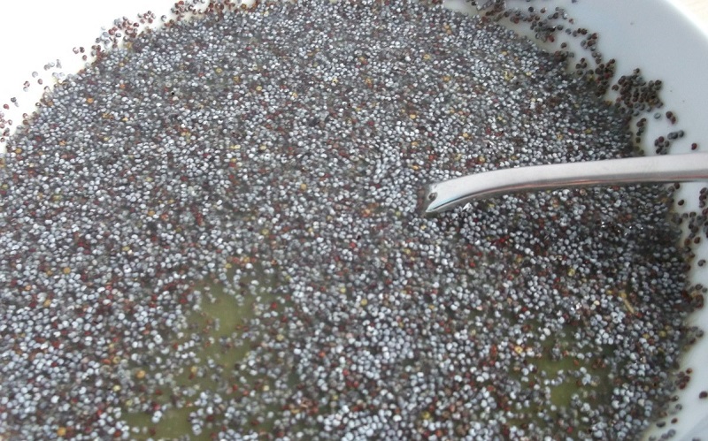 3. Do miski wsyp mak i zalej 160 ml soku pomarańczowego. Odstaw, niech nasiąknie.