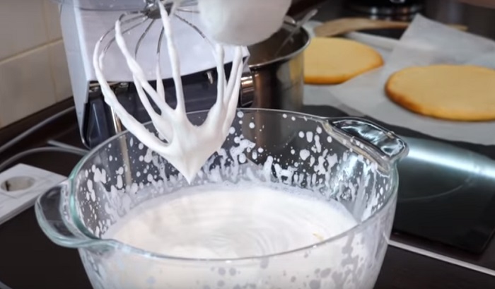 7. Pora na krem śmietanowy. Wymieszaj żelatynę z wodą. Ubij 500 ml schłodzonej śmietany mikserem. Kiedy śmietana zacznie gęstnieć, dodaj do niej skondensowane mleko i ubijaj przez kolejne 3 minuty. Potem wlej żelatynę i wymieszaj. Krem powinien być gęsty.