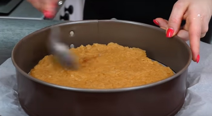 8. Przygotuj formę do pieczenia o wymiarach 26 cm. (zwróć uwagę, że ciasto ma mniejszą średnicę). Na spodzie połóż ciasto. Na nim równomiernie rozłóż połowę nadzienia jabłkowego.