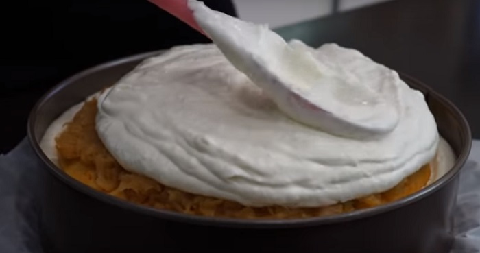 9. Następnie na nadzienie jabłkowe rozłóż połowę kremu śmietanowego, powinien wyjść poza krawędzie ciasta. Powtórz warstwy zaczynając od ciasta, potem jabłka i krem śmietanowy. Wygładź warstwę śmietanową wokół torcika i wstaw do lodówki na całą noc.