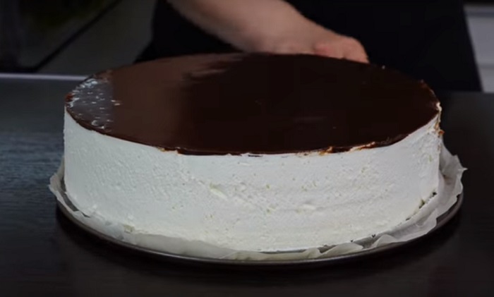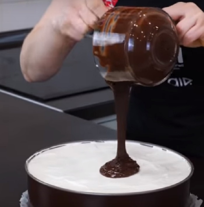 10. Rozpuść czekoladę w 50 ml śmietany i dobrze wymieszaj na gładką masę. Rozsmaruj czekoladę na wierzchu i wygładź. Wstaw do lodówki na pół godziny, czekolada musi ponownie zastygnąć.