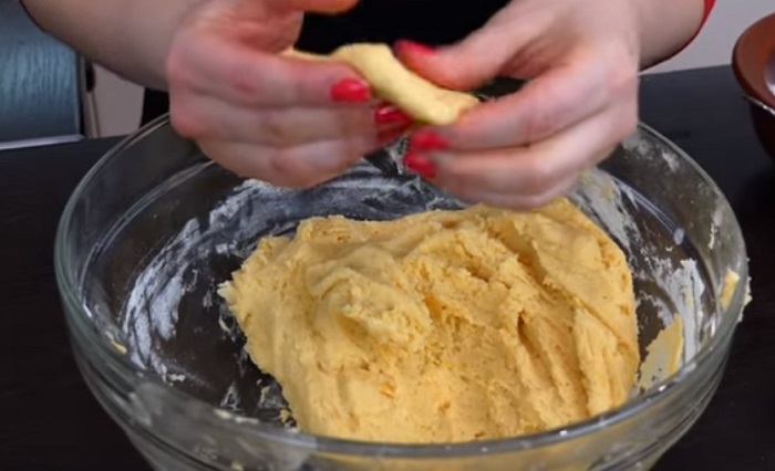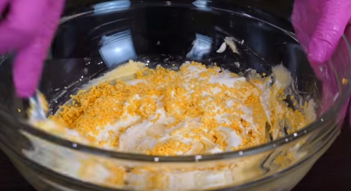 2. W osobnej misce wymieszaj śmietanę z proszkiem do pieczenia. Żółtka z ugotowanych wcześniej jajek zetrzyj na tarce o drobnych oczkach. Wszystkie składniki dodaj do masła, wsyp mąkę i dokładnie wymieszaj.