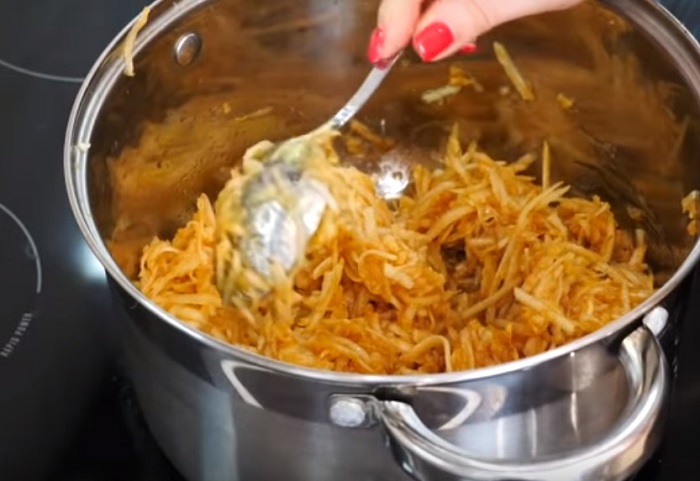 4. Czas przygotować nadzienie jabłkowe. Umyj i obierz jabłka. Zetrzyj je na tarce o grubych oczkach. Dodaj masło, miód i sok z cytryny. Dobrze wymieszaj i gotuj na średnim ogniu przez 5-7 minut pod przykryciem.