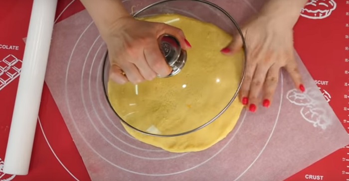 5. Wyjmij ciasto z lodówki i podziel je na 2 części. Rozwałkuj obie części do uzyskania średnicy 22 cm. (używam do tego pokrywki o tej samej średnicy).