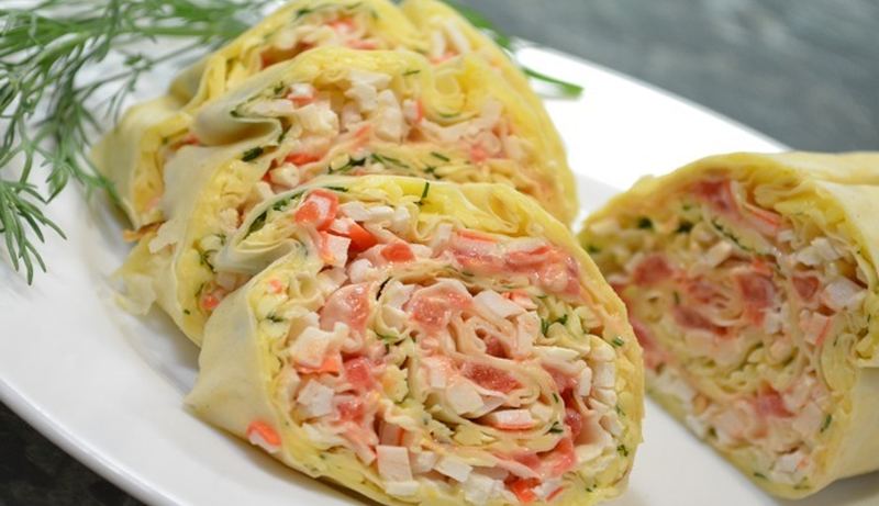 6. Pokrój w kostkę 250 g paluszków krabowych i 1 świeżego ogórka. 2 jajka ugotowane na twardo zetrzyj na tarce o grubych oczkach. Wymieszaj wszystko i dodaj majonez. Posól do smaku i dodaj ulubione zioła.